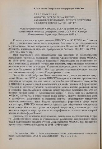 К 24-й сессии Генеральной конференции ЮНЕСКО. Предложения Комиссии СССР по делам ЮНЕСКО, касающиеся подготовки проекта Программы и бюджета на 1988-1989 годы. Письмо Генеральному директору (20 июня 1986 г.) // Печатается по архиву Комиссии СССР по делам ЮНЕСКО.
