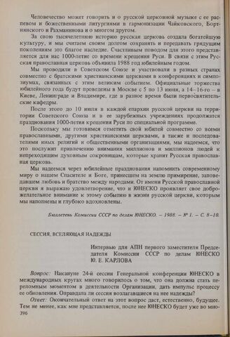 24-я сессия Генеральной конференции ЮНЕСКО, 1987 год. Сессия, вселяющая надежды. Интервью для АПН первого заместителя Председателя Комиссии СССР по делам ЮНЕСКО Ю.Е. Карлова // Бюллетень Комиссии СССР по делам ЮНЕСКО. - 1988. - № 1. - С. 4-7.
