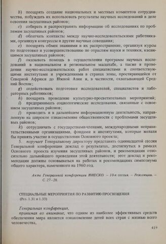 Резолюции 10-й сессии Генеральной конференции ЮНЕСКО, 1958 год. Специальные мероприятия по развитию просвещения (Рез. 1.31 и 1.33) // Акты Генеральной конференции ЮНЕСКО. - 10-я сессия. - Резолюции. - С. 16-17.