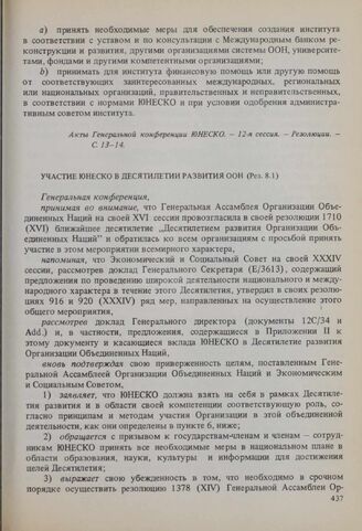 Резолюции 12-й сессии Генеральной конференции ЮНЕСКО, 1962 год. Участие ЮНЕСКО в десятилетии развития ООН (Рез. 8.1) // Акты Генеральной конференции ЮНЕСКО. - 12-я сессия. - Резолюции. - С. 78-79.
