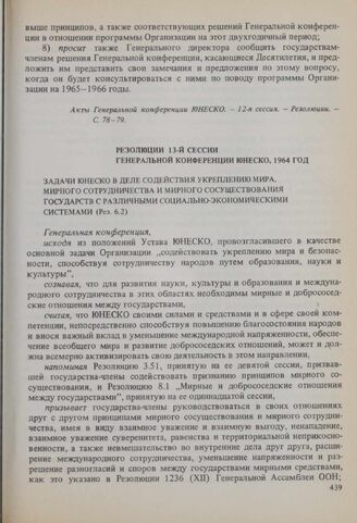 Резолюции 13-й сессии Генеральной конференции ЮНЕСКО, 1964 год. Задачи ЮНЕСКО в деле содействия укреплению мира, мирного сотрудничества и мирного сосуществования государств с различными социально-экономическими системами (Рез. 6.2) // Акты Генеральной конференции ЮНЕСКО. - 13-я сессия. - Резолюции. - С. 94-95.