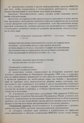 Резолюции 13-й сессии Генеральной конференции ЮНЕСКО, 1964 год. Междисциплинарные мероприятия в области защиты прав человека, экономических и социальных проблем, возникающих в странах, недавно ставших независимыми, экономических и социальных последствий разоружения и исследований по проблемам мира (Рез. 3.25) // Акты Генеральной конференции ЮНЕСКО. - 13-я сессия. - Резолюции. - С. 57-58.