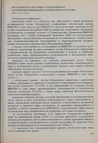 Резолюции 15-й сессии Генеральной конференции ЮНЕСКО, 1968 год. Вклад ЮНЕСКО в дело мира и задачи ЮНЕСКО в отношении ликвидации колониализма и расизма (Рез. 9.11 и 9.12) // Акты Генеральной конференции ЮНЕСКО. - 15-я сессия. - Резолюции. - С. 92-93, 96-97.