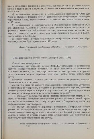 Резолюции 16-й сессии Генеральной конференции ЮНЕСКО, 1970 год. Развитие образования. О предотвращении утечки научных кадров (Рез. 1.243) // Акты Генеральной конференции ЮНЕСКО. - 16-я сессия. - Резолюции. - С. 27.