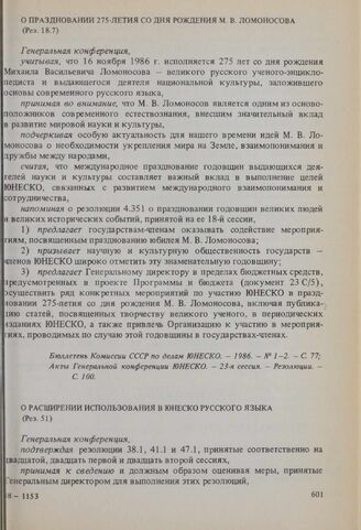 Резолюции 23-й сессии Генеральной конференции ЮНЕСКО, 1985 год. О праздновании 275-летия со дня рождения М.В. Ломоносова (Рез. 18.7)