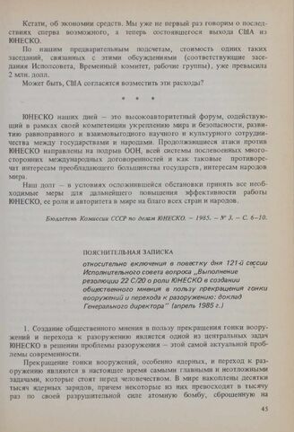 Пояснительная записка относительно включения в повестку дня 121-й сессии Исполнительного совета вопроса «Выполнение резолюции 22 С/20 о роли ЮНЕСКО в создании общественного мнения в пользу прекращения гонки вооружений и перехода к разоружению: доклад Генерального директора» Апрель 1985 г. // Архив Комиссии СССР по делам ЮНЕСКО.