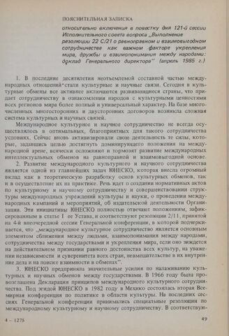 Пояснительная записка относительно включения в повестку дня 121-й сессии Исполнительного совета вопроса «Выполнение резолюции 22 С/21 о равноправном и взаимовыгодном сотрудничестве как важном факторе укрепления мира, дружбы и взаимопонимания между народами: доклад Генерального директора». Апрель 1985 г. // Архив Комиссии СССР по делам ЮНЕСКО.