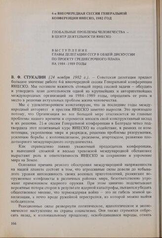 4-я внеочередная сессия Генеральной конференции ЮНЕСКО, 1982 год. Глобальные проблемы человечества — в центр деятельности ЮНЕСКО. Выступление главы делегации СССР в общей дискуссии по проекту Среднесрочного плана на 1984-1989 годы. 24 ноября 1982 г.