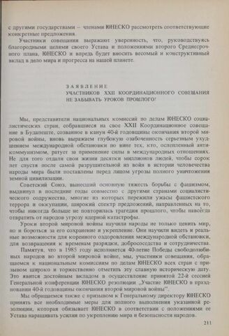 ХХII Координационное совещание, 1984 год. Заявление участников XXII Координационного совещания. Не забывать уроков прошлого // Бюллетень Комиссии СССР по делам ЮНЕСКО. - 1984. - № 4. - С 16-23.