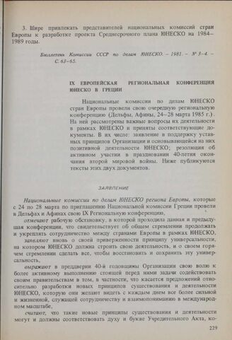 IX европейская региональная конференция национальных комиссий по делам ЮНЕСКО в Греции (1985 г.). Заявление (о ЮНЕСКО) // Бюллетень Комиссии СССР по делам ЮНЕСКО. - 1985. - №4 .- С. 33-34.