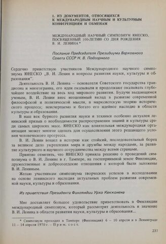 Международный научный симпозиум ЮНЕСКО, посвященный 100-летию со дня рождения В.И. Ленина. Послания Председателя Президиума Верховного Совета СССР, президента Финляндии и Генерального секретаря ООН