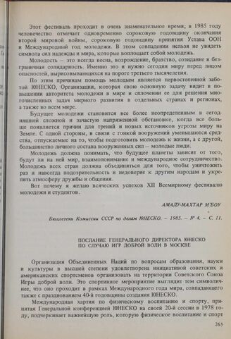 Послание Генерального директора ЮНЕСКО по случаю Игр доброй воли в Москве // Советский спорт. - 1986. - 9 июля; Бюллетень Комиссии СССР по делам ЮНЕСКО,. - 1986. - № 3. - С. 6.