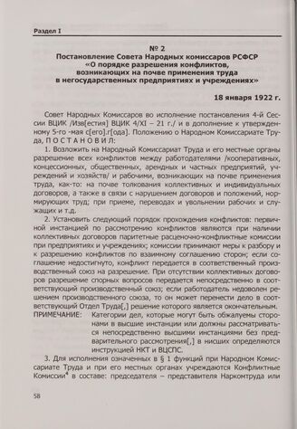 Постановление Совета Народных комиссаров РСФСР «О порядке разрешения конфликтов, возникающих на почве применения труда в негосударственных предприятиях и учреждениях». 18 января 1922 г.