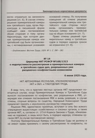 Циркуляр НКТ РСФСР №168/1313 о недопустимости рассмотрения в примирительных камерах и третейских судах дел, разрешенных уже расценочно-конфликтными комиссиями. 6 июня 1925 года