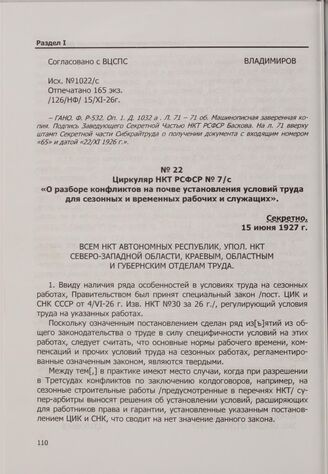 Циркуляр НКТ РСФСР № 7/с «О разборе конфликтов на почве установления условий труда для сезонных и временных рабочих и служащих». 15 июня 1927 г.