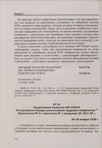 Предложения Коллегии НКТ РСФСР. Об упрощении порядка рассмотрения трудовых конфликтов. Приложение № 4 к протоколу № 1 заседания 28—30/I-28 г. 28—30 января 1928 г. // ГАНО. Ф. Р-532. Оп. 1. Д. 964. Л. 57-57об. Машинописная копия того времени.