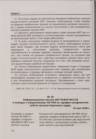 Информационное письмо НКТ РСФСР № 4/39 о выводах и предложениях НК РКИ по тарифно-конфликтной работе органов Наркомата труда. 15 мая 1928 г. // ГАНО. Ф. Р-532. Оп. 1. Д. 1182. Л. 26-29 об. Машинописная заверенная копия.