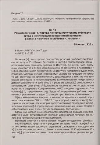 Разъяснение зав. Сибтруда Кокосова Иркутскому губотделу труда о компетенции конфликтной комиссии в связи с «делом о 45 рабочих «Лензото»». 28 июля 1922 г. // ГАНО. Ф. Р-532. Оп. 1. Д. 462. Л. 2-2об. Машинописный подлинник.
