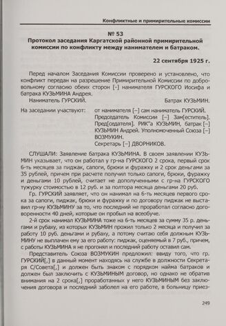 Протокол заседания Каргатской районной примирительной комиссии по конфликту между нанимателем и батраком. 22 сентября 1925 г. // ГАНО. Ф. Р-532. Оп. 1. Д. 848. Л. 109. Машинописная заверенная копия того времени.