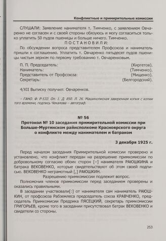 Протокол № 10 заседания примирительной комиссии при Больше-Муртинском райисполкоме Красноярского округа о конфликте между нанимателем и батраком. 3 декабря 1925 г. // ГАНО. Ф. Р-532. Оп. 1. Д. 850. Л. 44. Машинописная заверенная копия с копии.