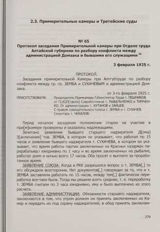 Протокол заседания Примирительной камеры при Отделе труда Алтайской губернии по разбору конфликта между администрацией Домзака и бывшими его служащими. 3 февраля 1925 г.