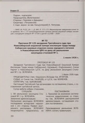 Протокол № 125 заседания Третейского суда при Новосибирской окружной камере инспекции труда между Сибирским краевым отделом союза народного питания и Новосибирским ЦРК по делу об увольнении закупщика столовой № 1. 1 июля 1926 г. // ГАНО. Ф. Р-532. Оп. 1. Д. 849. Л. 111. Машинописная заверенная копия того времени.