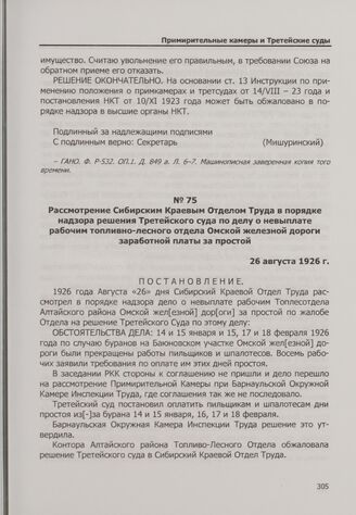 Рассмотрение Сибирским Краевым Отделом Труда в порядке надзора решения Третейского суда по делу о невыплате рабочим топливно-лесного отдела Омской железной дороги заработной платы за простой. 26 августа 1926 г.