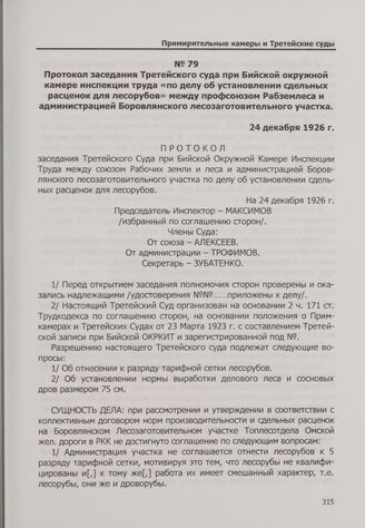 Протокол заседания Третейского суда при Бийской окружной камере инспекции труда «по делу об установлении сдельных расценок для лесорубов» между профсоюзом Рабземлеса и администрацией Боровлянского лесозаготовительного участка. 24 декабря 1926 г. // ГАНО. Ф. Р-532. Оп. 1. Д. 995. Л. 22-22 об. Машинописная заверенная копия того времени.