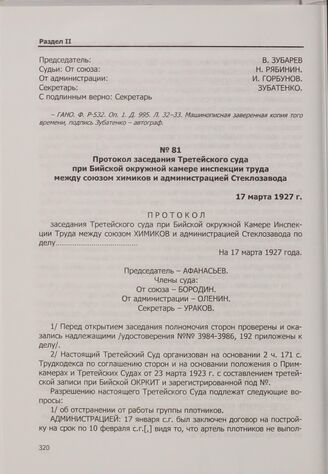 Протокол заседания Третейского суда при Бийской окружной камере инспекции труда между союзом химиков и администрацией Стеклозавода. 17 марта 1927 г. // ГАНО. Ф. Р-532. Оп. 1. Д. 995. Л. 44-45. Машинописная не заверенная копия того времени.