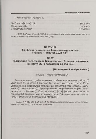 Конфликт на арендном Берикульском руднике. Телеграмма председателя Берикульского Рудкома районному комитету ВСГ о положении на руднике. [Не позднее 5 ноября 1924 г.] // ГАНО. Ф. Р-512. Оп. 1. Д. 578. Л. 14. Машинописная заверенная копия того времени.