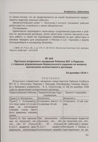 Конфликт на арендном Берикульском руднике. Протокол вторичного заседания Райкома ВСГ и Рудкома с главным управляющим Берикульского рудника по вопросу заключения коллективного договора. 10 декабря 1924 г. // ГАНО. Ф. Р-512. Оп. 1. Д. 578. Л. 50-51 об. Машинописный подлинник того времени.