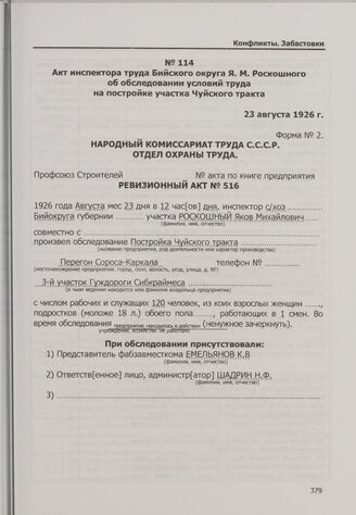 Конфликт в связи с недовольством условиями труда рабочих на восстановлении участка Чуйского тракта. Акт инспектора труда Бийского округа Я. М. Роскошного об обследовании условий труда на постройке участка Чуйского тракта. 23 августа 1926 г. // ГАНО. Ф. Р-532. Оп. 1. Д. 967. Л. 32-33 об. Машинописная заверенная копия того времени.