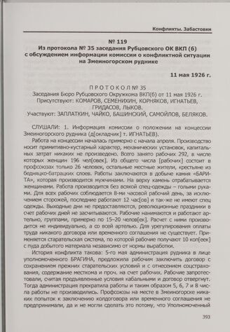 Конфликт на Змеиногорском руднике между рабочими и администрацией концессии «Лена Гольдфильдс». Из протокола № 35 заседания Рубцовского ОК ВКП(б) с обсуждением информации комиссии о конфликтной ситуации на Змеиногорском руднике. 11 мая 1926 г. // ГАНО. Ф. П-2. Оп. 2 «а». Д. 174. Л. 23-24. Машинописная копия.