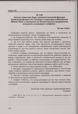 Конфликт на Змеиногорском руднике между рабочими и администрацией концессии «Лена Гольдфильдс». Письмо секретаря бюро коммунистической фракции Крайсовпрофсовета М. Гинзбурга секретарю Сибкрайкома ВКП(б) Лепа о положении на Змеиногорском предприятии концессии, вызвавшем конфликт. 19 мая 1926 г. // ГАНО. Ф. П-2. Оп. 2 «а». Д. 174. Л. 17. Машинописный подлинник.