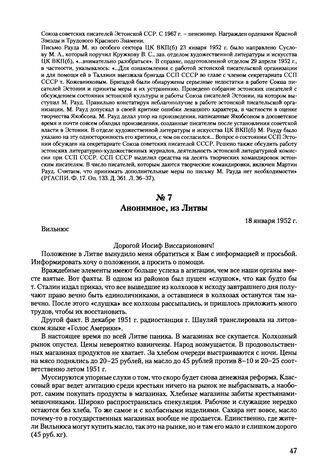 Письма, доложенные Сталину. И.В. Анонимное, из Литвы. Вильнюс, 18 января 1952 г. // РГАСПИ. Ф. 558. Оп. 11. Д. 903. Л. 78-80. Копия. Машинописный текст. Опубликовано: Советская национальная политика: идеология и практики. 1945-1953/Л.П. Кошелева и др. (сост.). М.: РОССПЭН, 2013. С. 654-655.