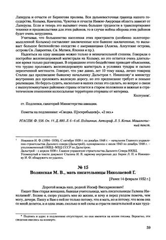 Письма, доложенные Сталину. И.В. Волянская М.В., мать писательницы Николаевой Г. [Ранее 14 февраля 1952 г.] // РГАСПИ. Ф. 17. Оп. 119. Д. 774. Л. 61-65. Подлинник. Машинописный текст. Подписи и правка - автограф. Л. 67-71. Заверенная машинописная копия.