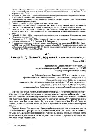Письма, доложенные Сталину. И.В. Байсаев М.Д., Манаев X., Абдуллаев А. - высланные чеченцы. 3 марта 1952 г. // РГАСПИ. Ф. 558. Оп. 11. Д. 903. Л. 65-66. Копия. Машинописный текст. Опубликовано: Советская национальная политика: идеология и практики. 1945-1953/Л.П. Кошелева и др. (сост.). М., 2013. С. 694 -695.