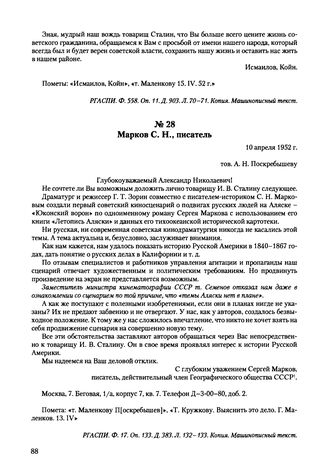 Письма, доложенные Сталину. И.В. Марков C.H., писатель. 10 апреля 1952 г. // РГАСПИ. Ф. 17. Оп. 133. Д. 383. Л. 132-133. Копия. Машинописный текст.