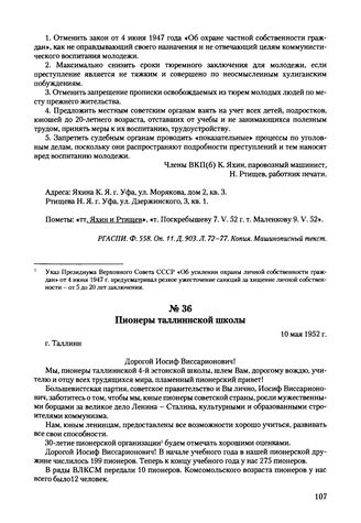 Письма, доложенные Сталину. И.В. Пионеры таллиннской школы. 10 мая 1952 г. // РГАСПИ. Ф. 558. Оп. 11. Д. 880. Л. 30-31. Подлинник. Рукописный текст. Л. 28-29. Копия. Машинописный текст.