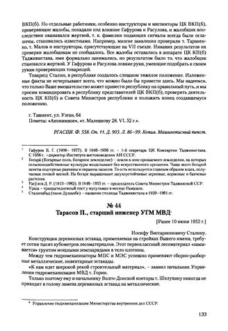 Письма, доложенные Сталину. И.В. Тарасов П., старший инженер УГМ МВД. [Ранее 10 июня 1952 г.] // РГАСПИ. Ф. 558. Оп. 11. Д. 903. Л. 1-2. Копия. Машинописный текст.