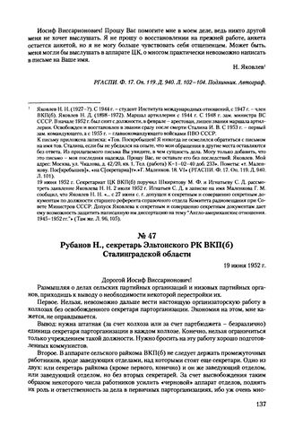 Письма, доложенные Сталину. И.В. Рубанов H., секретарь Эльтонского РК ВКП(б) Сталинградской области. 19 июня 1952 г.
