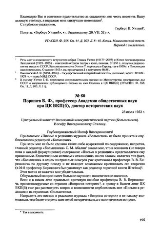 Письма, доложенные Сталину. И.В. Поршнев Б.Ф., профессор Академии общественных наук при ЦК ВКП(б), доктор исторических наук. 23 июля 1952 г.