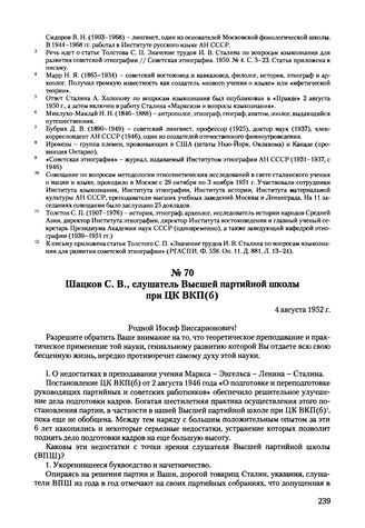 Письма, доложенные Сталину. И.В. Шацков С.В., слушатель Высшей партийной школы при ЦК ВКП(б). 4 августа 1952 г. // РГАСПИ. Ф. 17. Оп. 119. Д. 1040. Л. 89-99. Подлинник. Машинописный текст. Подпись - автограф.