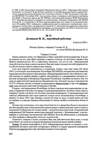 Письма, доложенные Сталину. И.В. Деомидов М.И., партийный работник. 8 августа 1952 г. // РГАСПИ. Ф. 17. Оп. 119. Д. 1060. Л. 153-156. Подлинник. Машинописный текст. Подпись - автограф.