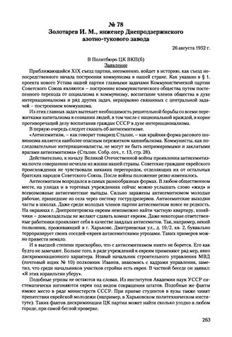 Письма, доложенные Сталину. И.В. Золотарев И.М., инженер Днепродзержинского азотно-тукового завода. 26 августа 1952 г. // РГАСПИ. Ф. 558. Оп. 11. Д. 901. Л. 54-59. Копия. Машинописный текст. Опубликовано: Советская национальная политика: идеология и практики. 1945-1953 /Л.П. Кошелева и др. (сост.). М., 2013. С. 855-858.
