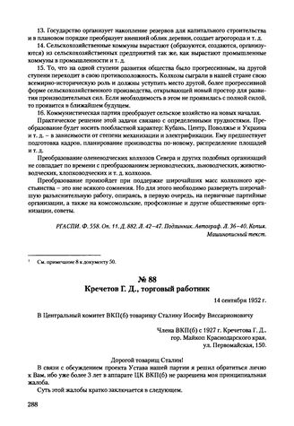 Письма, доложенные Сталину. И.В. Кречетов Г.Д., торговый работник. 14 сентября 1952 г. // РГАСПИ. Ф. 558. Оп. 1. Д. 901.Л. 90-93. Копия. Машинописный текст.