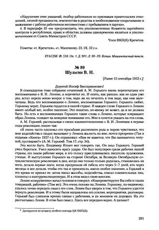 Письма, доложенные Сталину. И.В. Шульгин В.Н. [Ранее 15 сентября 1952 г.] // РГАСПИ. Ф. 558. Оп. 11. Д. 903. Л. 50-55. Копия. Машинописный текст. Ф. 17. Оп. 119. Д. 1061. Л. 231-236. Копия. Машинописный текст. Опубликовано в книге Власть и художественная интеллигенция: Документы 1917-1953 гг. Международный фонд «Демократия». М., 1999. С. 682-686.