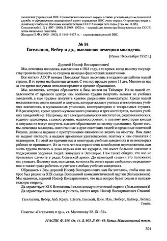 Письма, доложенные Сталину. И.В. Гагельганц, Вебер и др., высланная немецкая молодежь. [Ранее 16 сентября 1952 г.] // РГАСПИ. Ф. 558. Оп. 11. Д. 903. Л. 68-69. Копия. Машинописный текст.