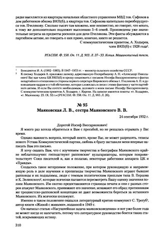 Письма, доложенные Сталину. И.В. Маяковская Л.В., сестра Маяковского В.В. 24 сентября 1952 г.