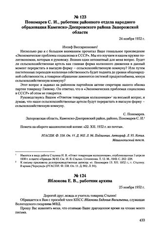 Письма, доложенные Сталину. И.В. Пономарев С.И., работник районного отдела народного образования Каменске-Днепровского района Запорожской области. 24 ноября 1952 г. // РГАСПИ. Ф. 558. Оп. 11. Д. 902. Л. 96. Подлинник. Автограф. Л. 95. Копия. Машинописный текст.